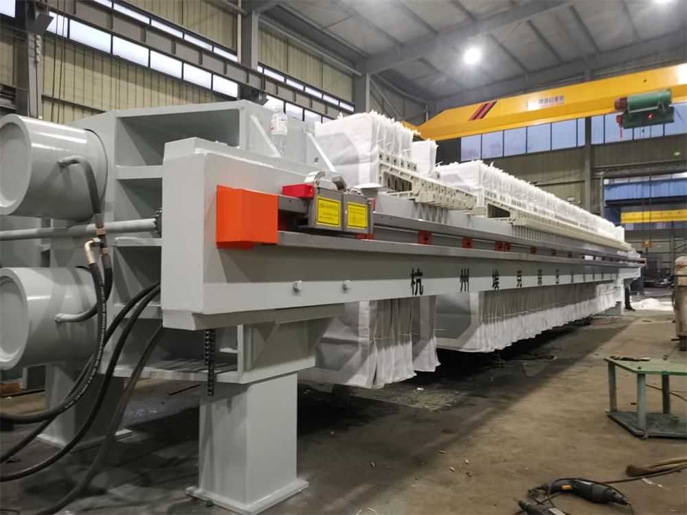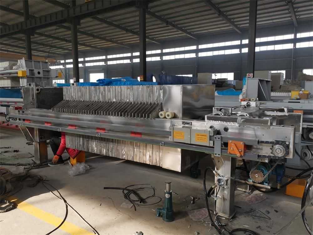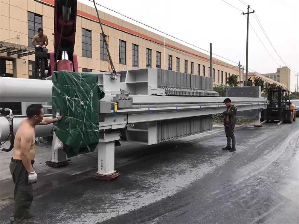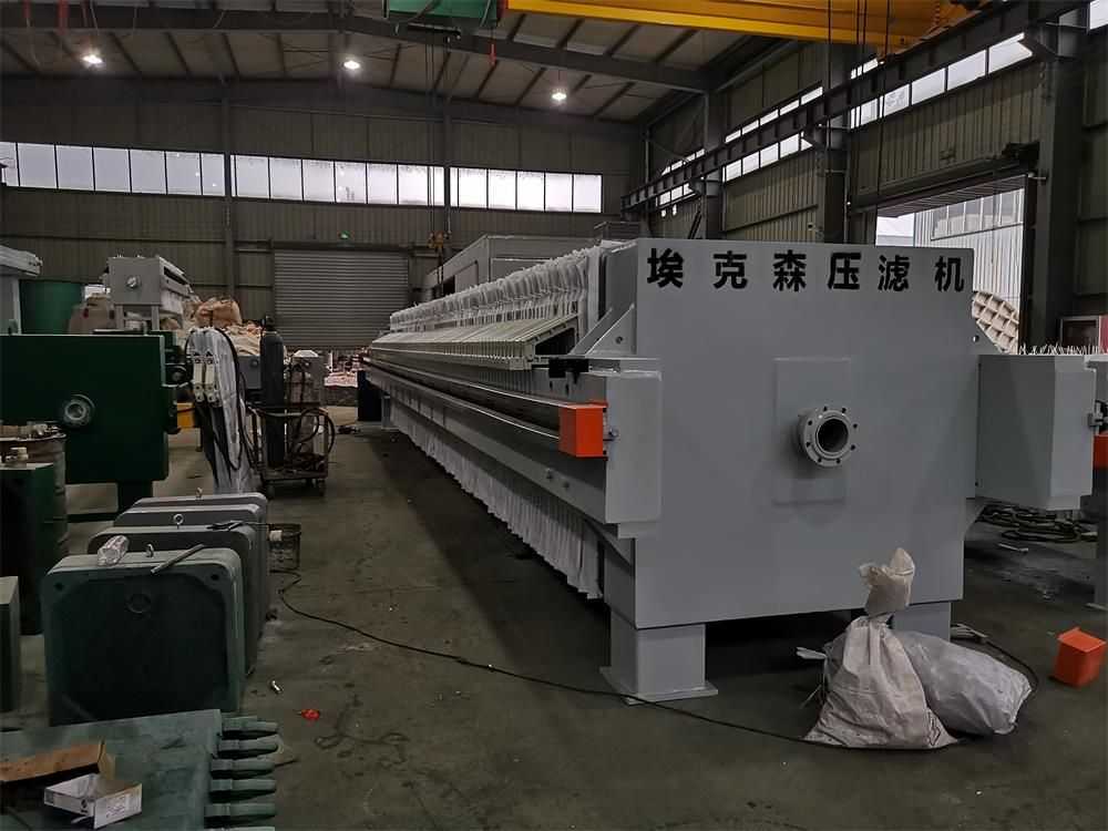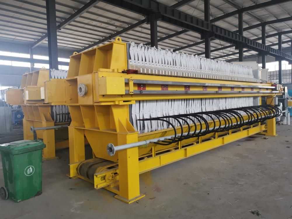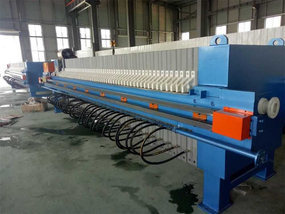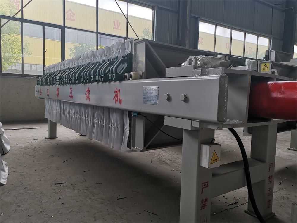 隔膜壓榨壓濾機是由隔膜板和廂式濾板排列組成濾室,在輸料泵的壓力作用下將料漿輸入濾室,通過過濾介質(zhì)(濾布)將料漿中的固體和液體分離,當料漿中的固體形成餅后,再向隔膜通入空氣,對濾室內(nèi)的固體充分壓榨。